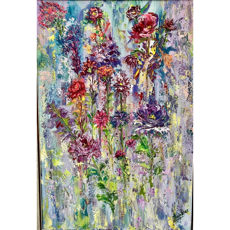 Obra em acrilico sobre tela 57x77 , técnica do Espatulado - FLORAL - com moldura em patna branca medindo 4 cm.